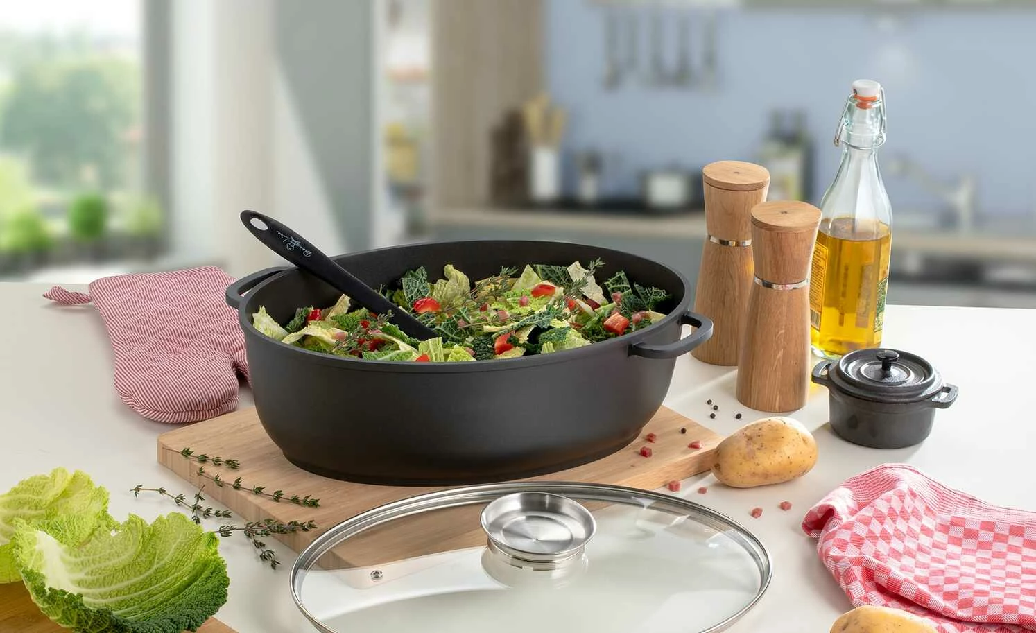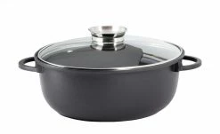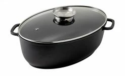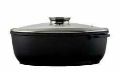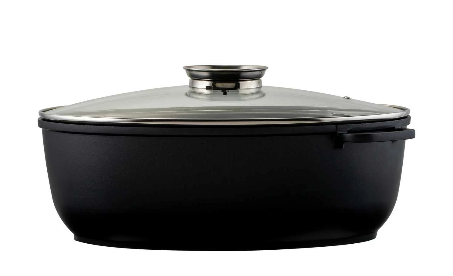 Ob Sonntagsbraten oder Weihnachtsgans – mit diesem Bräter sind Sie gut gerüstet. Der Glasdeckel mit Aromaknopf bietet die Möglichkeit, Garflüssigkeiten wie Wein oder Brühe anzugießen, ohne Energie durch das Öffnen des Deckels zu verlieren.