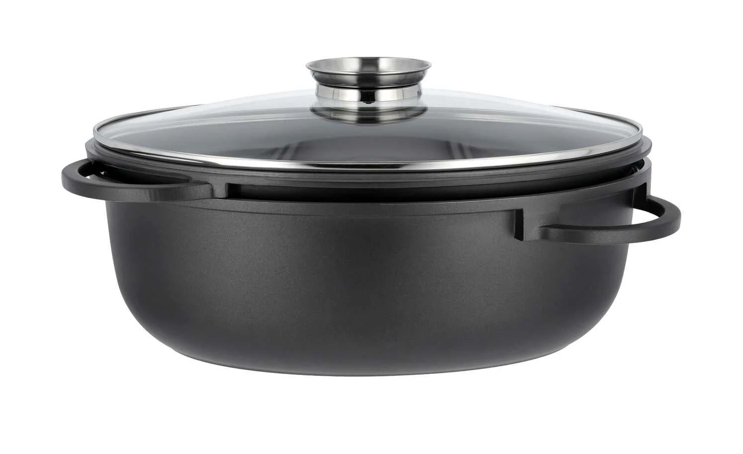 - Mehr zu Ausstattung / Funktion: Glasdeckel mit Aromaknopf , Aluguss-Pfanne kann statt des Glasdeckels als Bräterdeckel verwendet werden