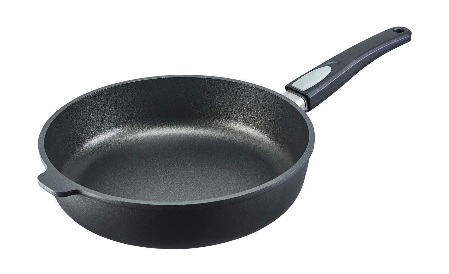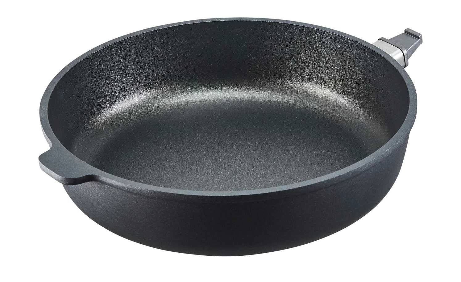 Diese Pfanne ist ideal fĂŒr gesundes, schonendes Garen und Zubereiten von z.B. Currys oder anderen Pfannengerichten. Durch den abnehmbaren Griff ist Warmhalten und Weitergaren im Ofen möglich – die Pfanne ist bis 250°C backofenfest! Der hochwertige Aluminiumguss und der extra massive Boden sorgen fĂŒr eine optimale WĂ€rmespeicherung und perfekte WĂ€rmeleitung.
